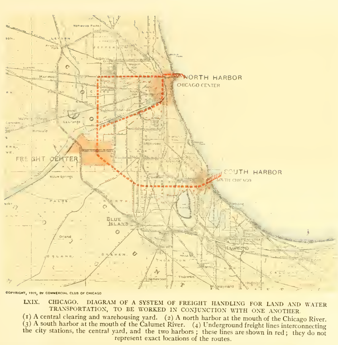 Historical Map: The Plan of Chicago – Proposed Arrangement of Railroad Stations, 1909