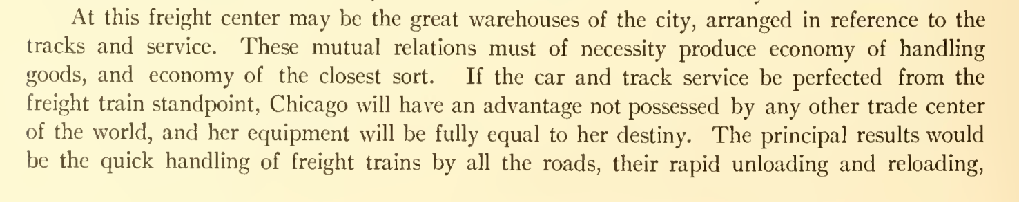 In the end, what the Plan revealed wasn’t just a vision of a more beautiful Chicago, it was a city on the brink of collapsing under its own success. The chaos of overlapping rail lines, congested streets, and an overburdened Loop made it clear that growth without intention had consequences. Separating people from freight, centralizing distribution, and rethinking the movement of both goods and commuters were necessities.